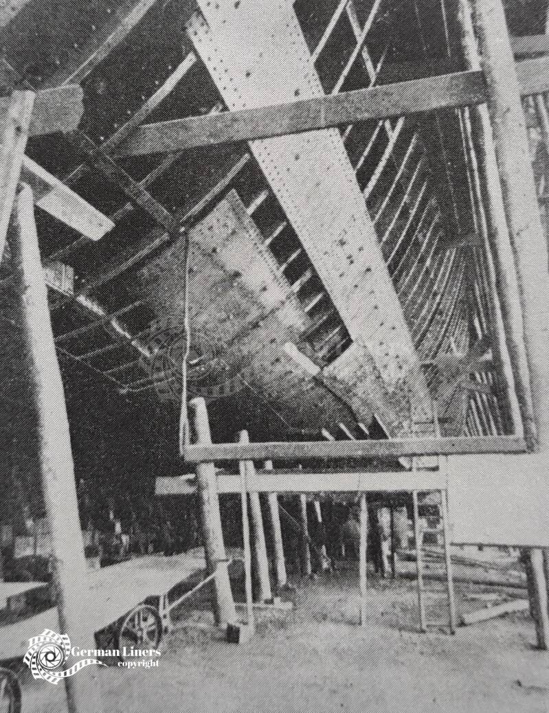 For ships the size of Kaiser Wilhelm II it was nessecary to lift the massive stern-section out of the water. The river Oder in which the ships were launched at the Vulcan Shipyard was not deep enough and the machinery placed in the middle and aft-section of the ship caused the stern to sink deep leaving to little under keel clearance. Extra buoyancy was created with pontons and wooden beams lifting the stern exposing the rudder framing. Here we see the immense Kaiser Wilhelm II leaving her builders to Ostswine.