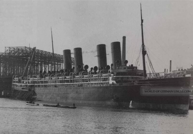 Left side we see Kaiser Wilhelm II at her final fitting-out phase almost ready to be towed to Ostswine at which location she would stay for a couple of days before she then would be prepared to be towed to her contractors, the Norddeutscher Lloyd, which were anxiously waiting to put the new huge liner in to service as running-mates to her two sisterships.