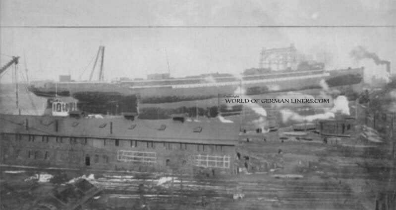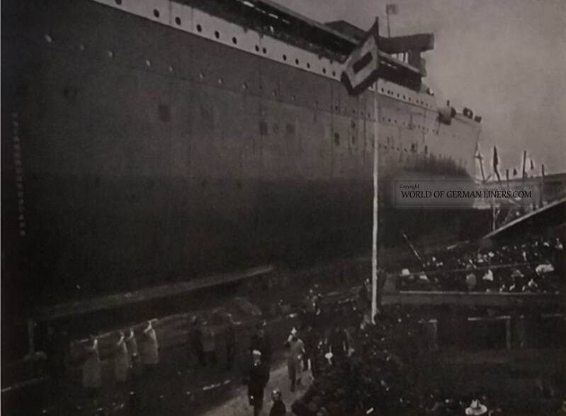 The immense hull of the "Kronprinz Wilhelm" ready for launch within a few moments witnessed by thousands of spectators.
